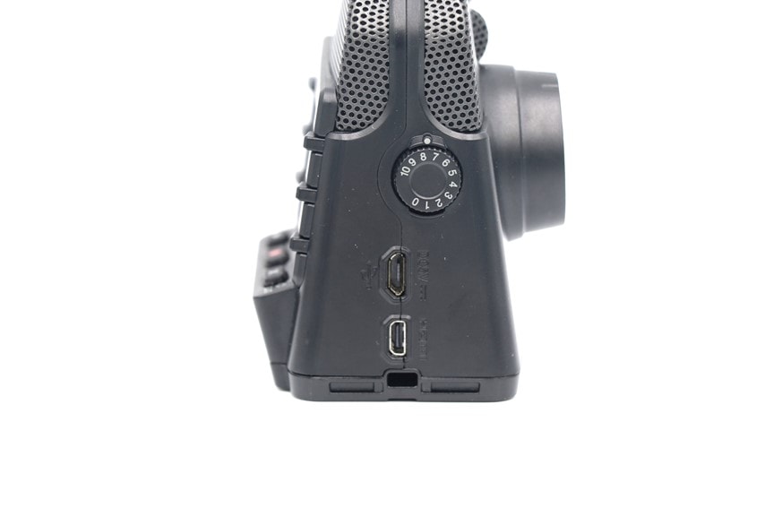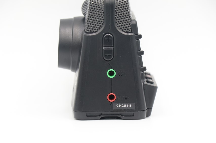 また、サイドに外部マイクとイヤホンを接続できる端子が用意されています。