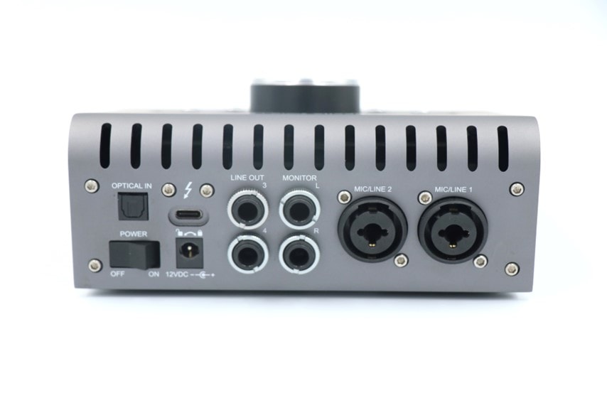 入力は背面のコンボジャック2基、OPTICAL IN、前面のHi-Z楽器入力です。