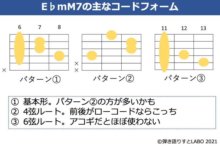 僕も上記の覚え方をしているため、E♭mM7はパターン①で覚えてます。
