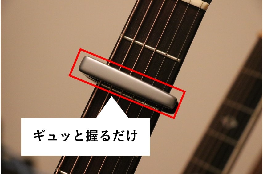 しかし、最初はギュッとつけてもどこかしらの弦がビビる人も多いはず。