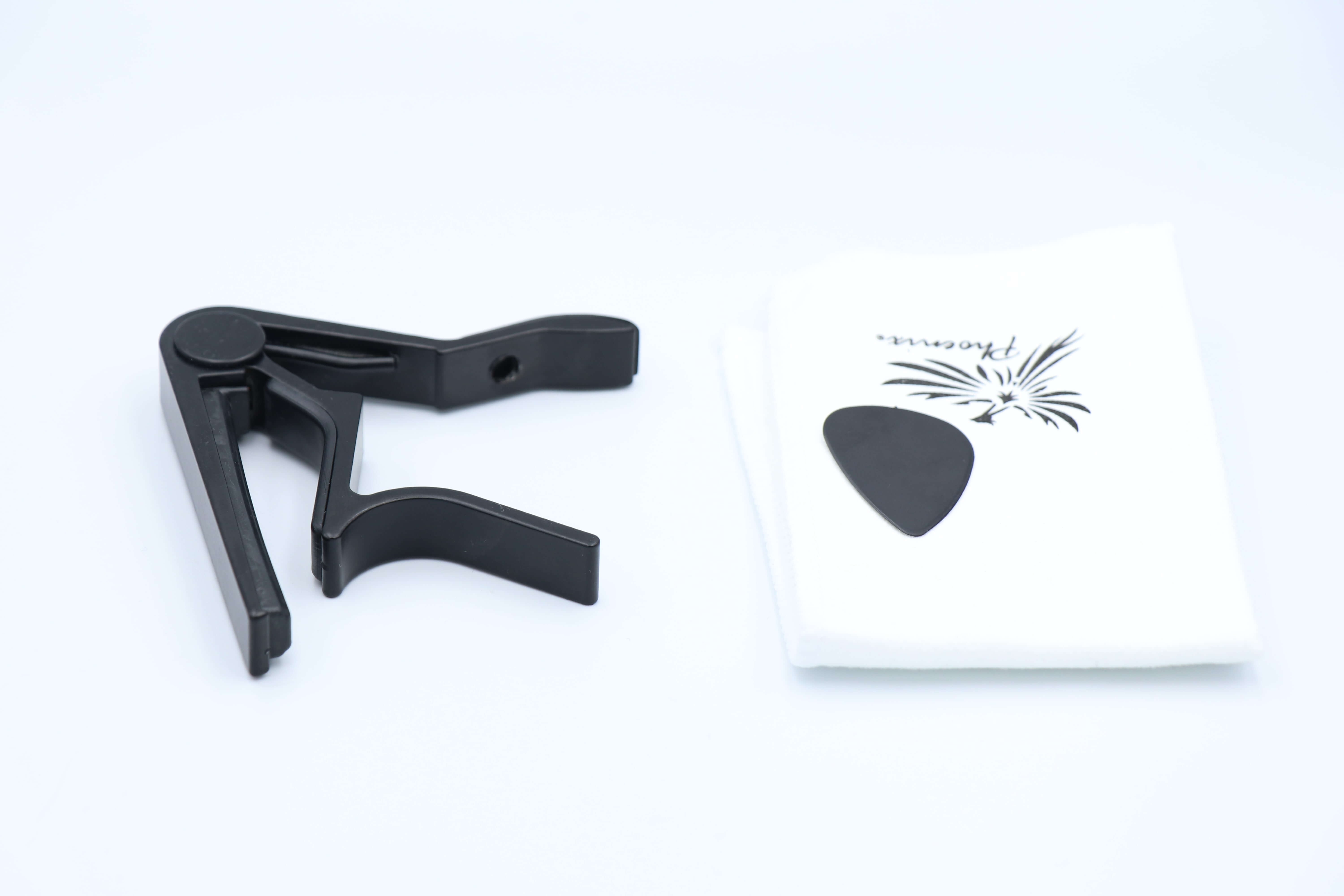 カポタスト本体に加えて、ピックとファイバークロスが付属されています。