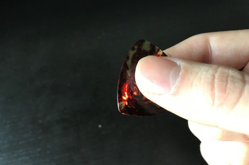 筆者はエレキギターだと、ピックを深めに持つことが多いですね。
