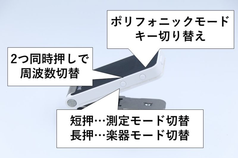 楽器モードの切り替えは本体横の操作ボタン(測定モード切替)を長押しで実施します。